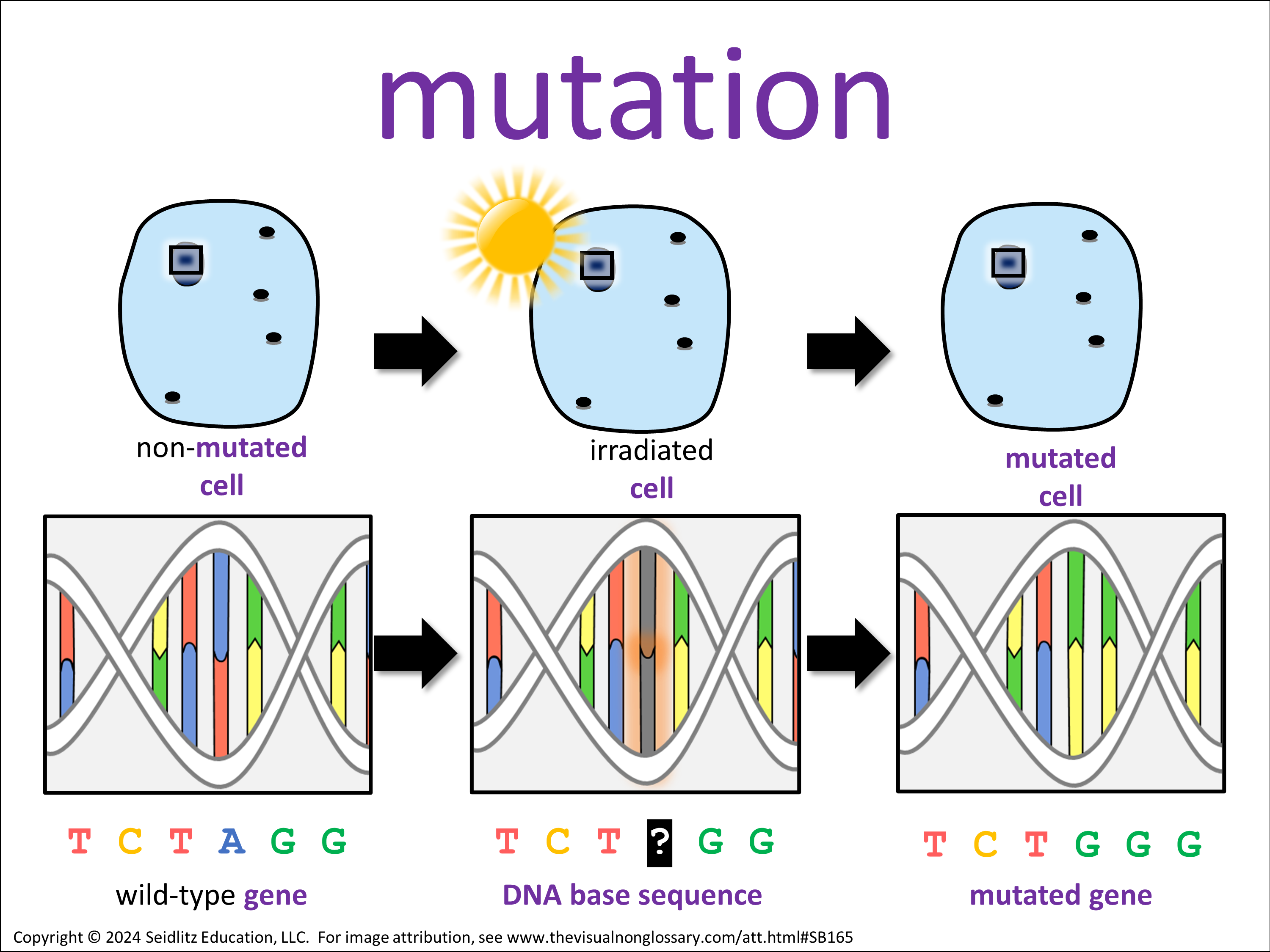 A mutation occurs by a change in the DNA sequence, as shown when a base in the irradiated cell is different from the one in the normal cell.