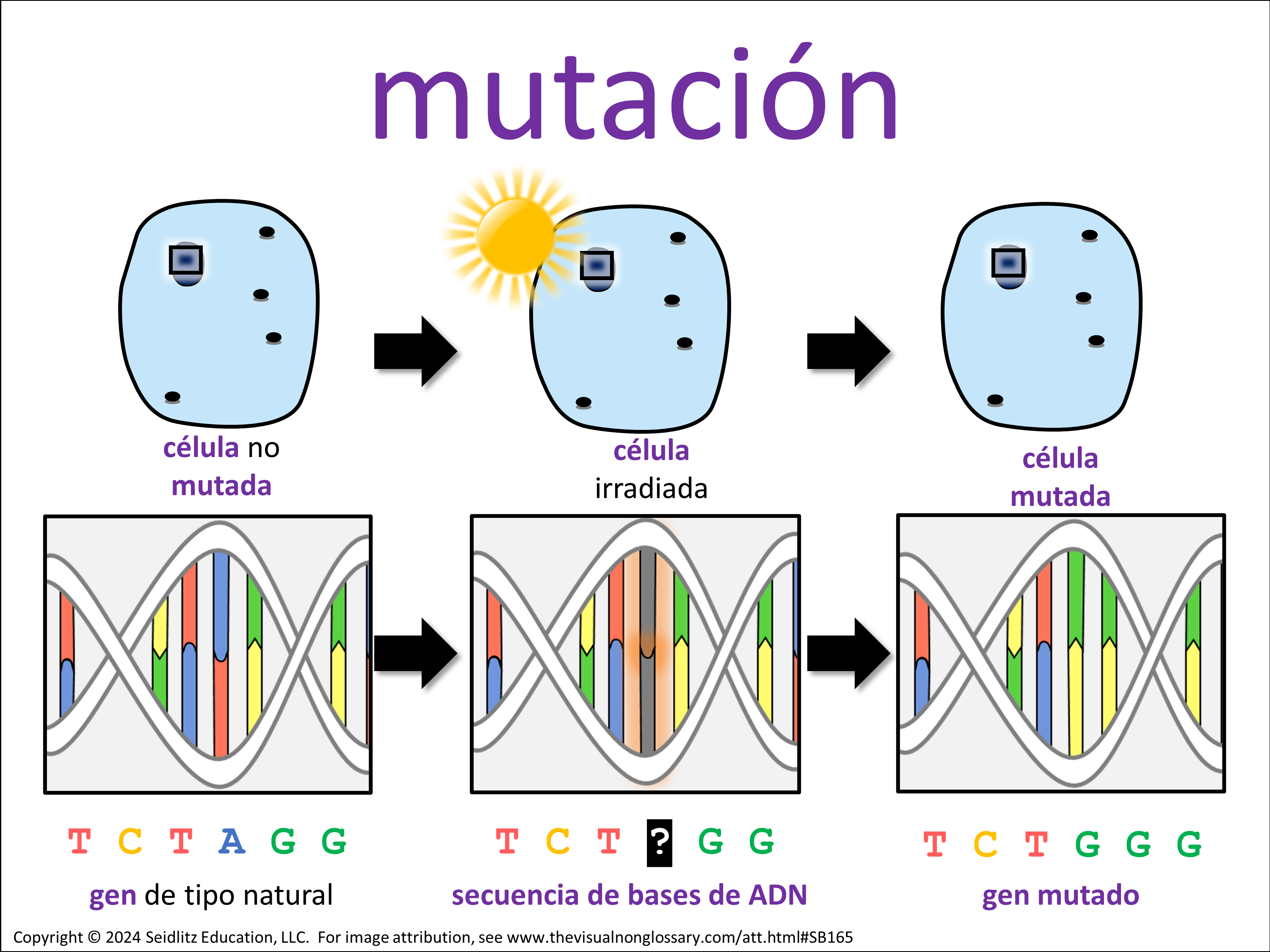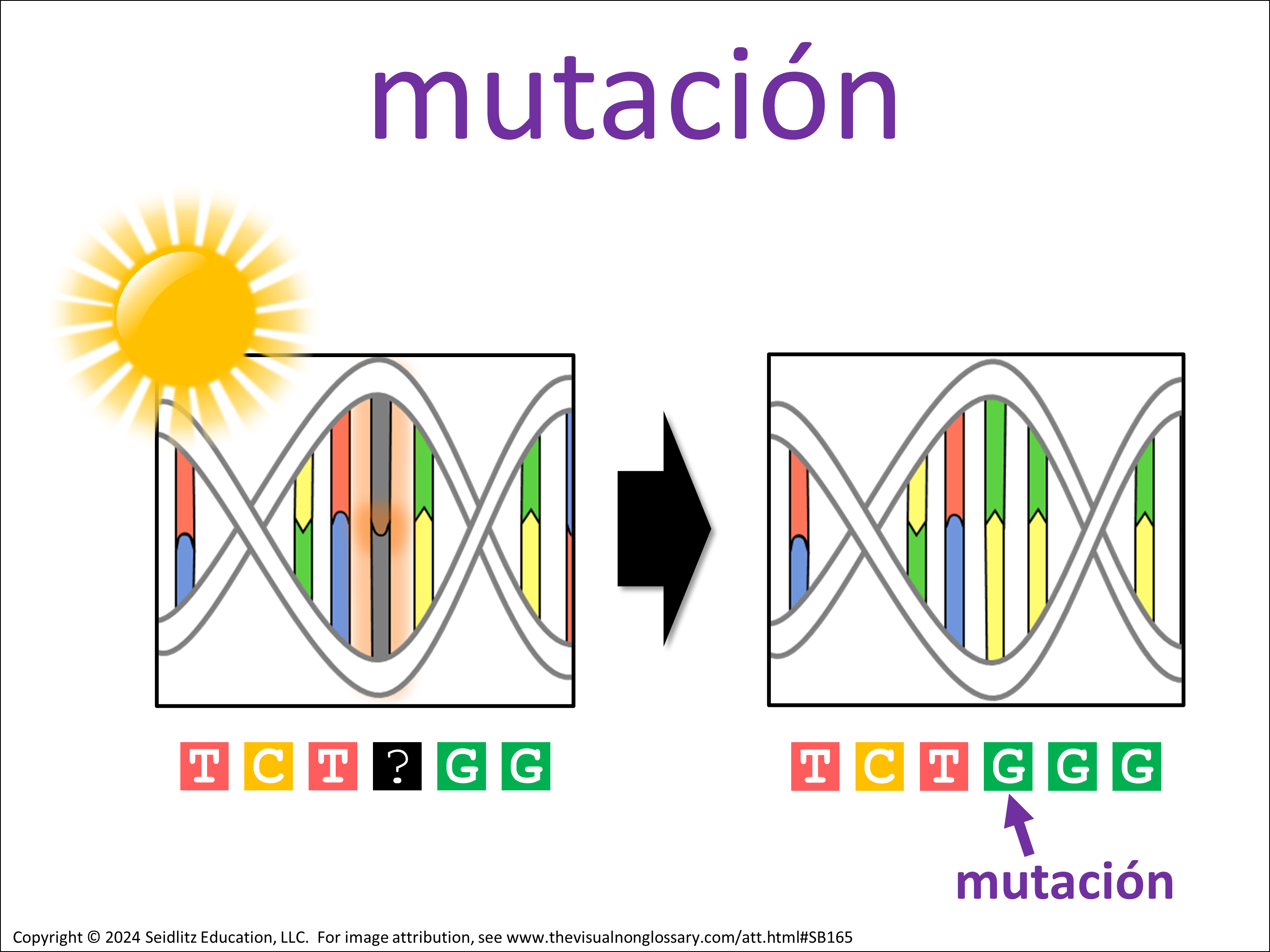 - El cambio en el ADN está resaltado con un cuadro rojo, enfatizando la base que se alteró.