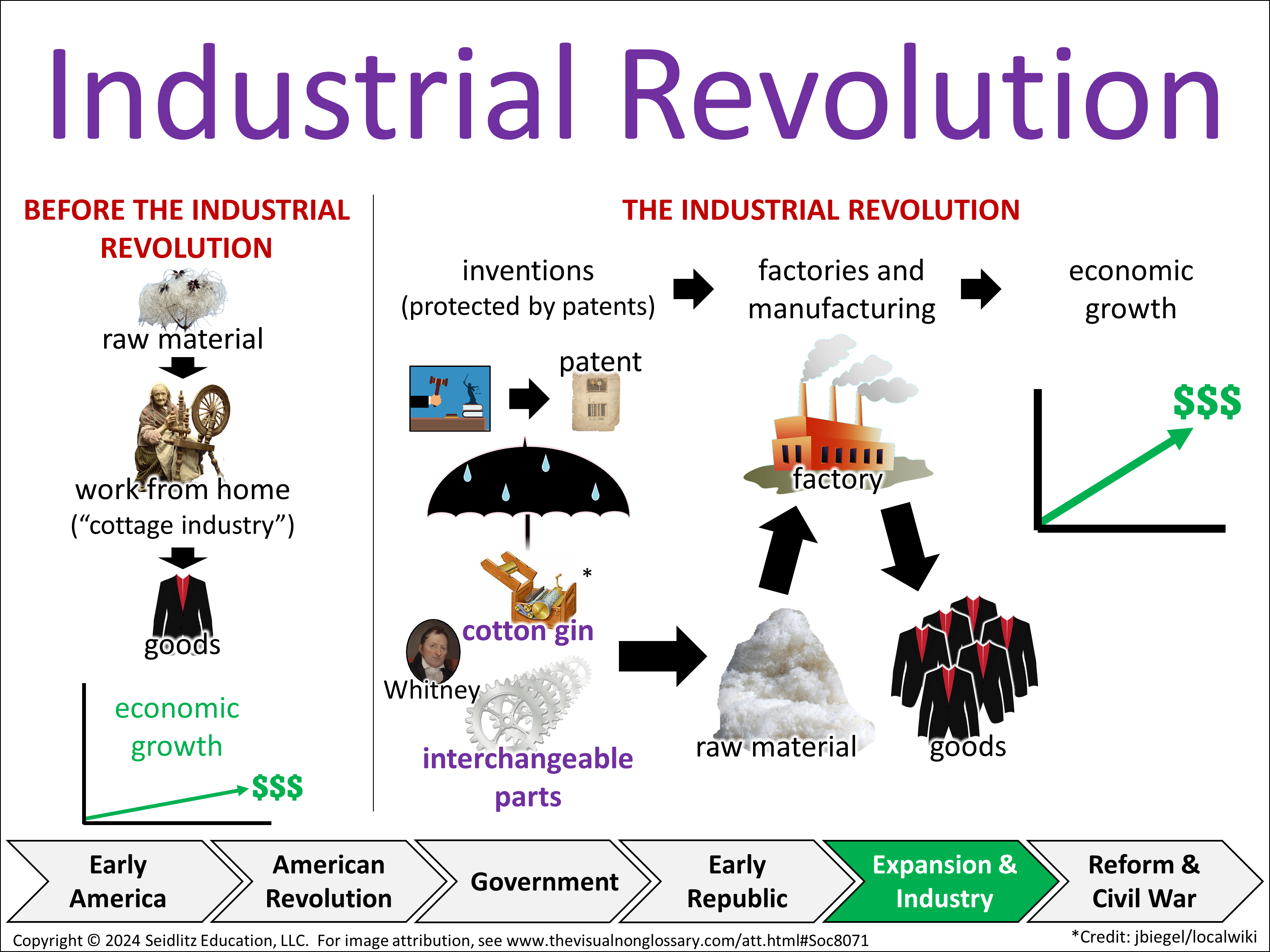 In the Industrial Revolution, new inventions like the cotton gin and interchangeable parts led to the growth of factoriesand manufacturing, which caused increased economic growth.